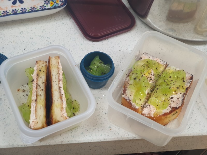 아침도시락으로 만들어줬는데 저 네조각 중 한조각 먹으면서 오른쪽 사진 작은통에 든 오이 다 드셨단다. 오이는 정말정말 많이 넣을수록 맛있나 보다. 결국 오이부족으로 한조각 남겨오심.