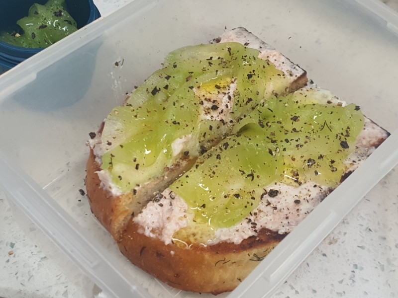 처음엔 명란 안쓰고 그냥 크림치즈에 오이, 후추, 올리브유 뿌려 먹었는데 가염버터에 구운 빵이라 그런지 내 기준엔 간이 딱 맞았고 짠걸 좋아하는 와이프는 간이 약간 부족하다 느꼈다고 했다.
