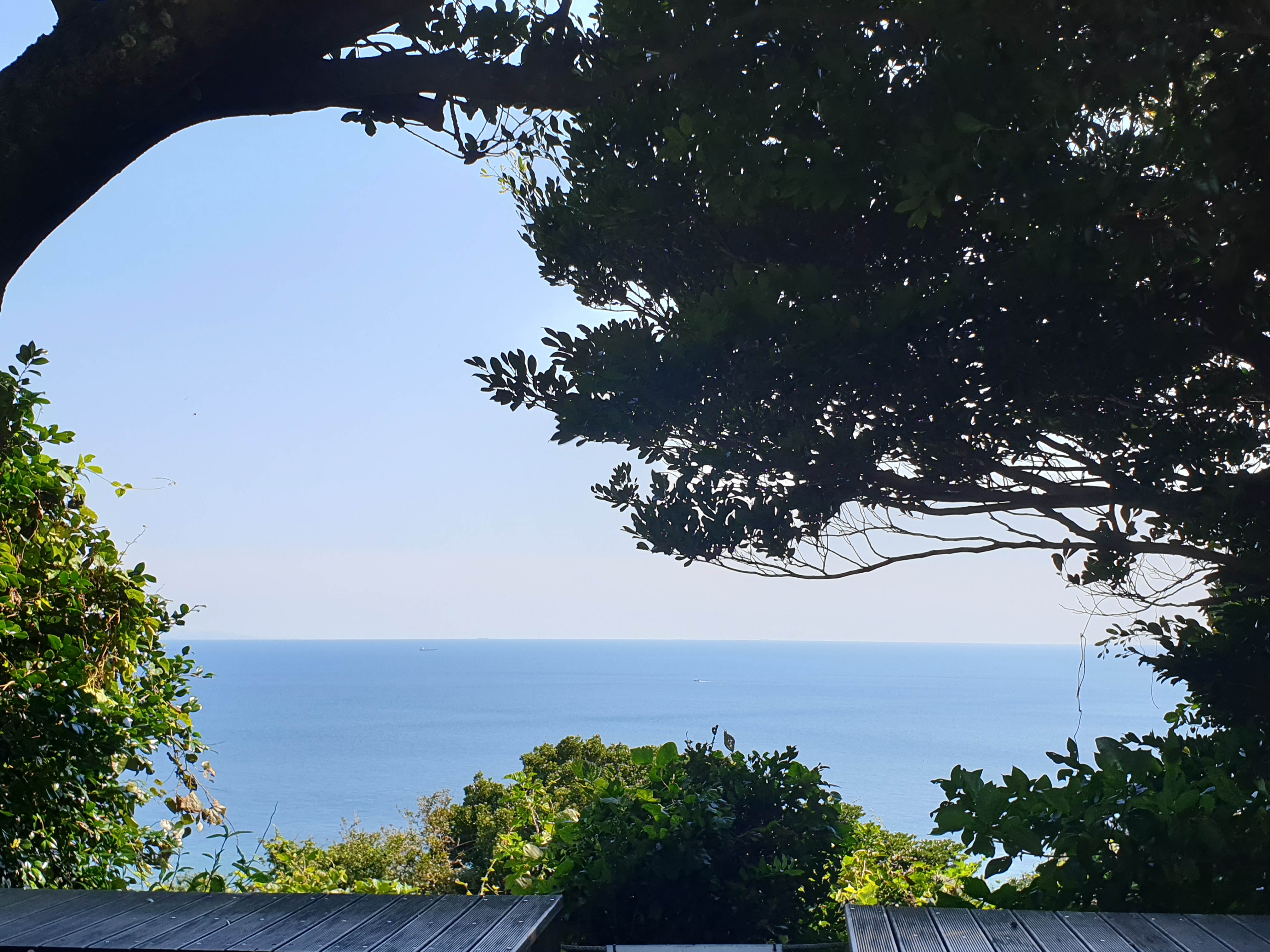 쉼터에 다다랐을 때 나무들 사이로 진한 수평선이 보였다.