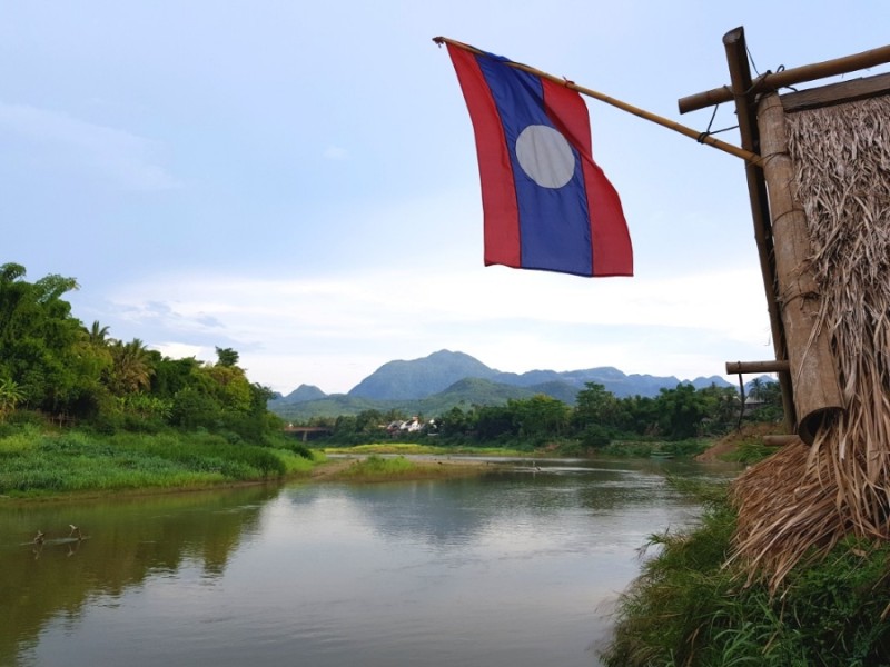 다리 입구에 라오스 깃발이 펄럭이고 있었다. 라오스 국기는 붉은색 바탕에 강이 흐르는 것처럼 중간 부분이 파랗고 가운데 하얀 동그라미가 그려져 있었다.