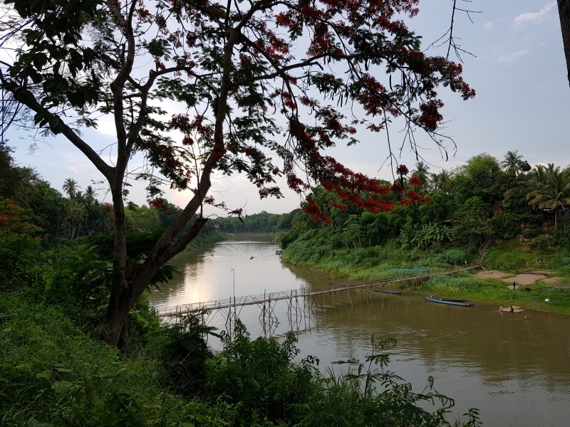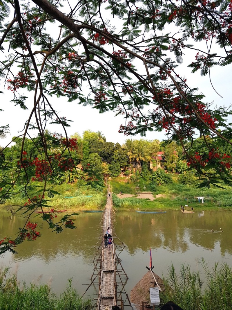 다리 주변에 붉은 꽃이 아름답게 피어나 있었다. 계단을 따라서 아래로 내려가 다리를 건너려는데, 그냥 건널 수 있는 다리가 아니었다. 1인당 5,000낍의 입장료를 내야 건너갈 수 있는 다리였다.