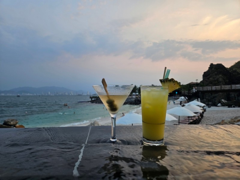 뗏목 위에서 한참 노을을 보다가 다시 바다를 헤엄쳐서 해변으로 돌아왔다. 어둑어둑해지는 시간이라 바다에서 놀기에는 위험해서 수영장에서 칵테일을 마시며 수영도 하고 쉬기도 하며 잔잔하게 놀았다.
