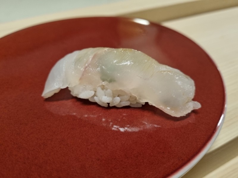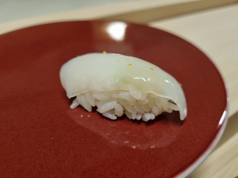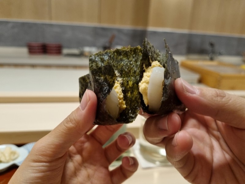무늬오징어라고 하셨는데, 난 이 오징어 초밥 먹을 때 꾸덕하게 이빨이 오징어에 쓱 들어가는 그 식감이 좋다. 그리고 항상 오징어 위에 슥슥 뿌려주시는 유자향이 너무 좋고. 오징어와 밥 사이에는 시소잎이 들어갔는지 그 향도 좋았다. 뭔가 상큼하면서도 꾸덕한 그런 맛.