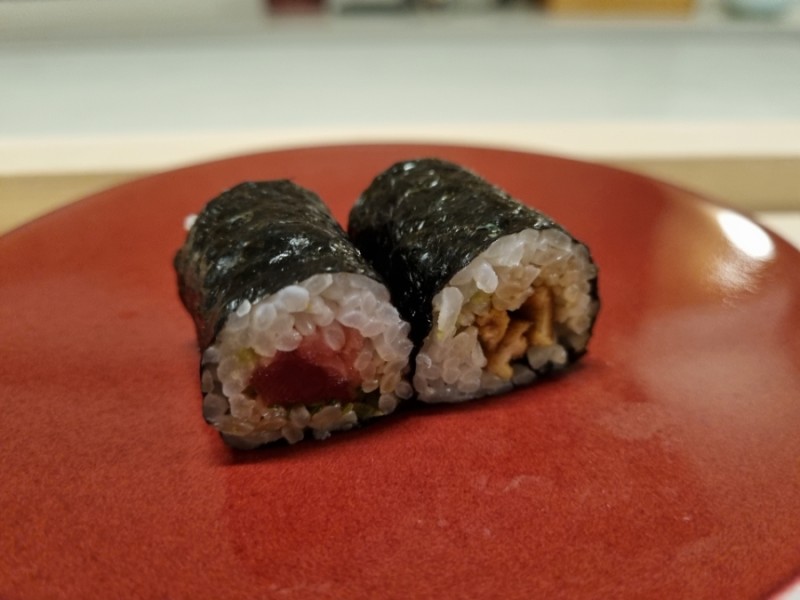 예상되는 맛이었지만 맛나게 먹었다. 예전에 라쿠친 스시 왔을 때 김에다가 밥, 참치 막 다지듯이 썬거를 퍽 얹어서 돌돌 말아서 손에 쥐어주면 그거 진짜 맛나게 먹곤 했는데. 그 때 기억이 새록새록 났다.