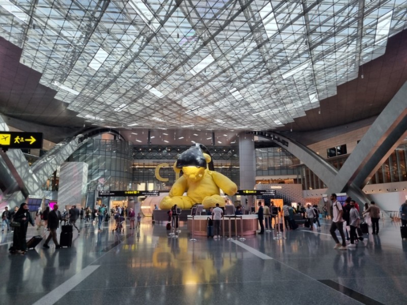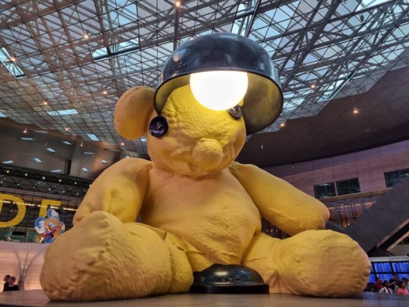 카타르 공항에서 2시간 30분 뒤에 암만으로 가는 비행기를 타야했다. 시간이 꽤나 남은 상황이었다. 공항을 둘러보며 쇼핑 좀 하고 맛난 것들을 사먹을까 싶었다. 카타르 공항에서 가장 인상적이었던 것은 이 흐물흐물 무너져내리는 것 같던 곰돌이 조형물이었다.