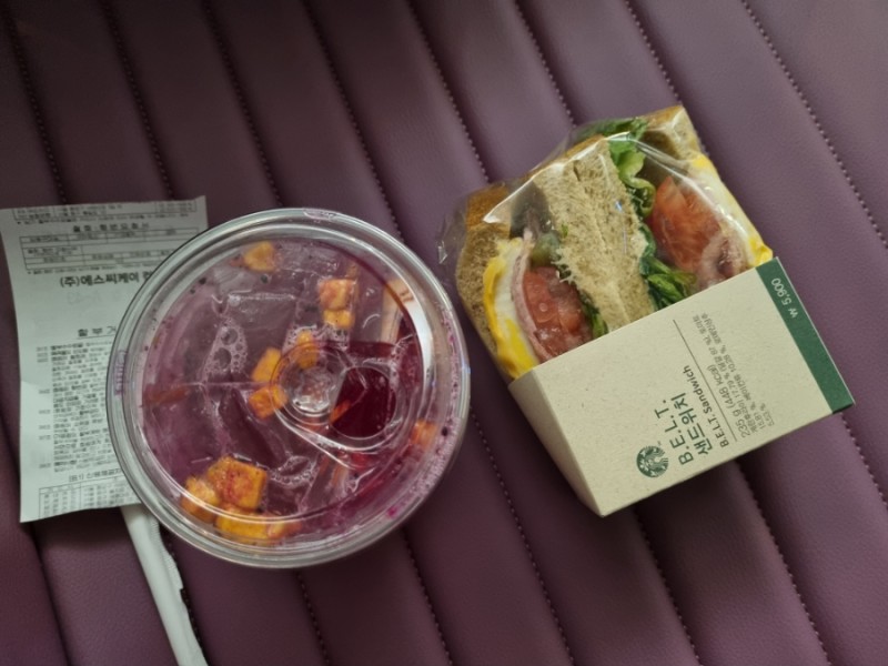 비행기에 오르기 전 비상 식량으로 스타벅스에서 음료와 샌드위치를 샀다. 기내식이 맛없어서 별로 먹지 못하는 경우에 중간에 배가 많이 고파서 항상 뭘 사들고 들어가곤 했다. 이번에도 사들고 가길 정말 잘했다. 카타르 항공 기내식은, 음, 배를 채우기 위해서 열심히 먹었다.
