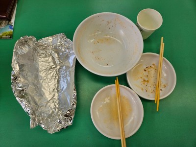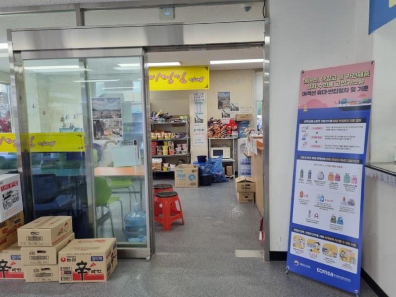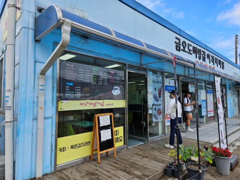 금오도에 가서 바로 비렁길을 걷기 위해서 미리 배부터 좀 채워놔야 했다. 배 타기까지 남은 시간은 30여분, 우리는 매표소 옆에 있는 비렁길 카페에서 간단히 아침을 해결했다. 우리가 먹은 메뉴는 묵은지 라면과 김밥, 정말 맛나게 먹었다. 그릇을 싹싹 다 비우고 물을 마시며 숨을 돌리고 있는데, 카페 이모님께서 금오도는 처음이냐고 물어보셨다. 처음이라고 하니까 팜플렛 지도를 펼쳐놓고 알짜배기 정보들을 알려 주셨다.
