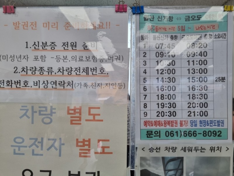 표를 구입할 때와 배에 승선할 때 신분증 검사를 하니 신분증은 꼭 챙겨와야 한다. 그리고 배에 승선할 때 운전자를 제외한 사람들은 모두 내려서 따로 배에 올라야 한다. 우리는 10시 30분에 금오도로 출발하는 배표를 구매했다.