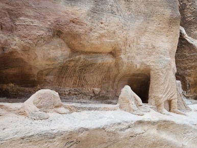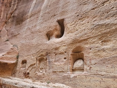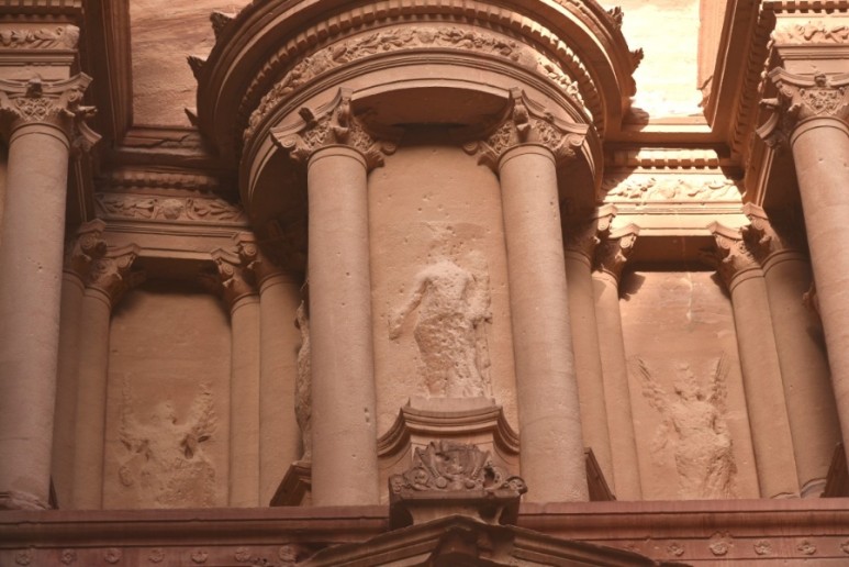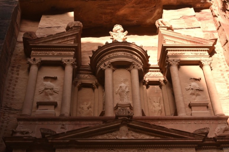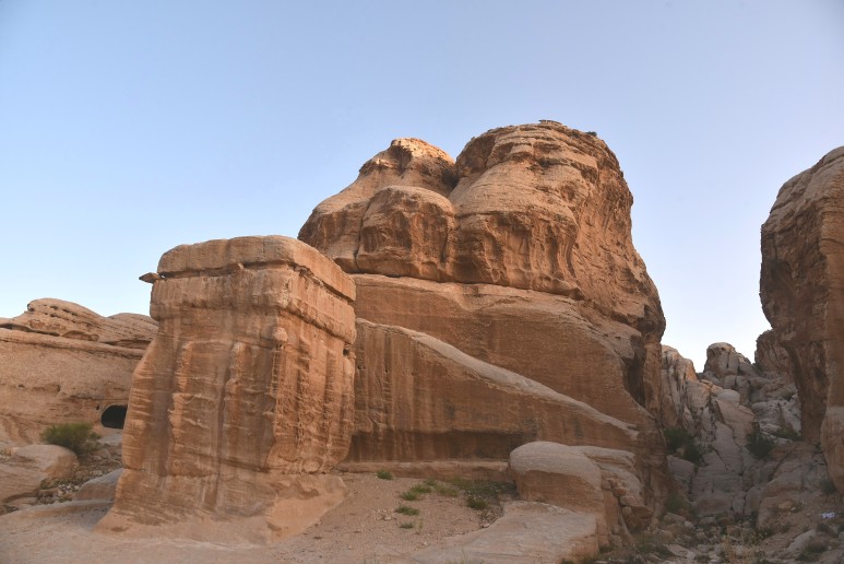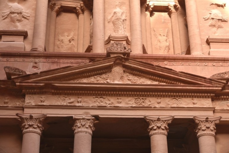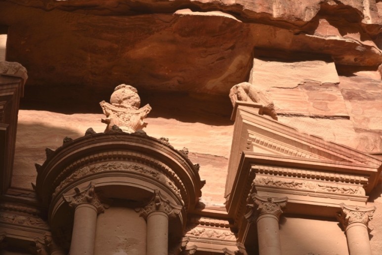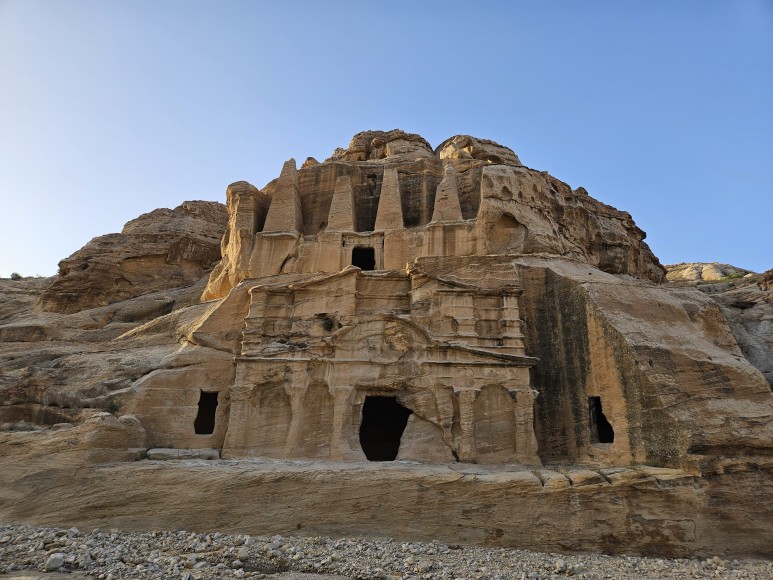 알 카즈네와 알 데이르는 사진으로 많이 봤었는데, 시크 협곡으로 가는 길에 못 봤던 낯선 건축물을 만나게 되었다. 우러러 보아야할 정도로 큰 암석 위로 건물의 형체가 보였다. 가운데에 입구가 있었고 좌우로 기둥이 이어졌다. 천장 위에는 2층이 이어지고, 기둥들과 네 개의 삼각뿔 모양의 구조물이 보였다.
