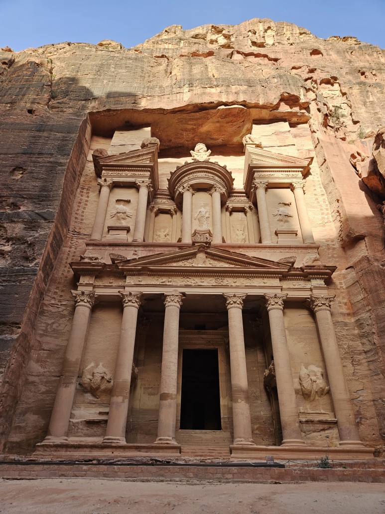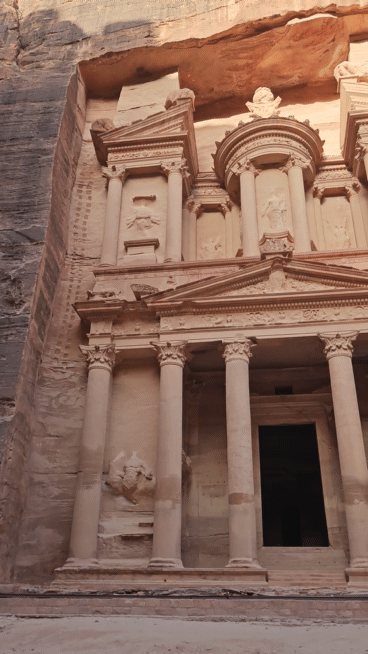 사진으로 그렇게 많이 보았건만 내 상상보다 훨씬 더 멋있고 감동적이었다. 때마침 아침 햇살이 알 카즈네를 사라락 비추고 있어서, 이 낯선 공간은 더 신비롭게 느껴졌다.알 카즈네(Al Khazneh) 알 카즈네와 마주섰다. 그리고 천천히 그 모습을 눈에 담았다. 갑자기 시간이 멈춰버린 것 같았다. 이 세상에 우리 둘 그리고 알 카즈네만 존재하는 것 같았다. 이 위대한 건축물을 만들어낸 이름 모를 인간에 대한 경외심이 막 샘솟았다. 대단해.