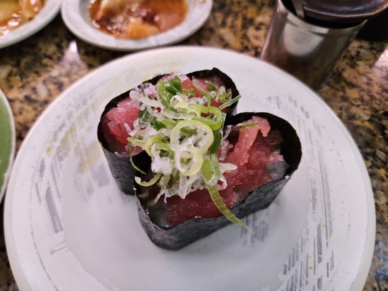 다진 파와 참치 초밥 이것도 맛있었다. 다만 다음에는 이런 종류 보단 순수초밥(참치, 도미, 고등어 등등)을 위주로 먼저 시키는게 더 좋을듯 했다.