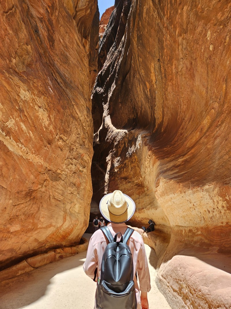 즐거웠던 협곡 사이의 길은 땡볕으로 변해 있었다. 암벽 사이로 해가 다 들이차서 그늘이 별로 없었다. 너무 더웠는데 그 와중에 스카프를 꺼내 머리에 뒤집어 써야 했다. 내리쬐는 햇볕이 너무 강렬해서 정수리가 따가웠기 때문이다. 우는 주섬주섬 가방 안에 있던 밀짚 모자를 꺼내 썼다. 😅😅