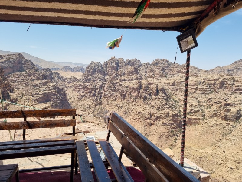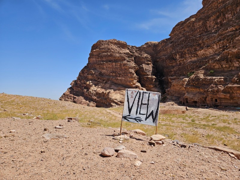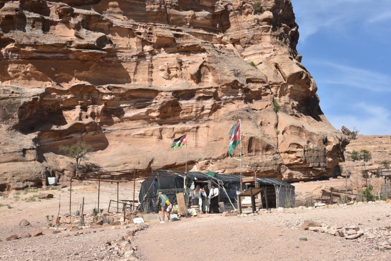 기념사진을 찍고 길을 걷다가 'View'라는 안내판을 보고 화살표를 따라서 돌계단을 걸어 올라갔다. 작은 암산 꼭대기에는 천막이 있었고 국기가 펄럭이고 있었다. 저곳에 가면 멋진 뷰를 볼 수 있다는 것인가? 호기심에 가보았던 꼭대기에는 베두인의 천막이 있었다.